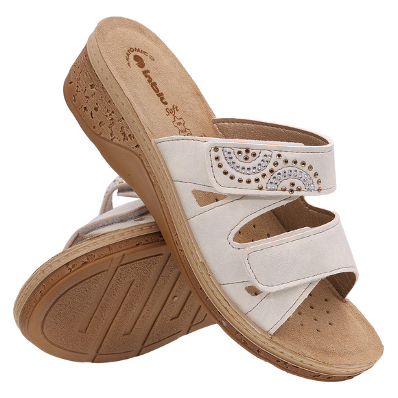 • INBLU - obuwie damskie, klapki profilaktyczne o charakterze rekreacyjnym, produkcji polskiej. Wierzch z tworzywa skóropodobnego. Wkładka wewnętrzna z naturalnej skóry. Spód z lekkiego, sprężystego tworzywa PU.