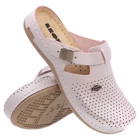 • LEON - klapki damskie medyczne, profilaktyczne, sanitarne o charakterze rekreacyjnym. Wierzch: skóra naturalna. Wkładka wewnętrzna: naturalna skóra. Spód: lekkie tworzywo PU.