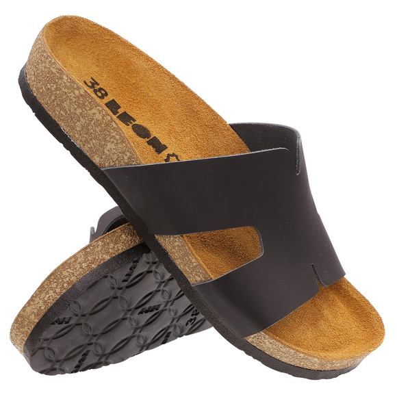 • LEON - klapki damskie casual, profilaktyczne o charakterze rekreacyjnym. Wierzch: skóra naturalna. Wkładka wewnętrzna: naturalna skóra. Spód: lekkie tworzywo PU.