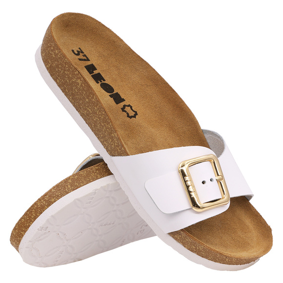 • LEON - klapki damskie casual, profilaktyczne o charakterze rekreacyjnym. Wierzch: skóra naturalna. Wkładka wewnętrzna: naturalna skóra. Spód: lekkie tworzywo PU.