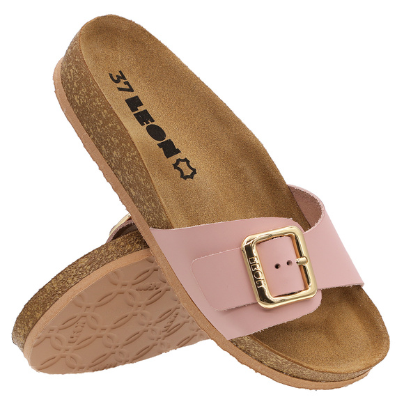 • LEON - klapki damskie casual, profilaktyczne o charakterze rekreacyjnym. Wierzch: skóra naturalna. Wkładka wewnętrzna: naturalna skóra. Spód: lekkie tworzywo PU.
