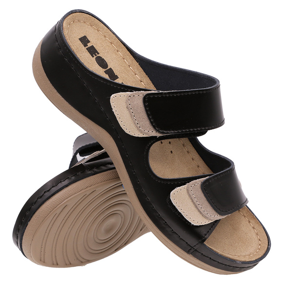 • LEON - klapki damskie casual, profilaktyczne, o charakterze rekreacyjnym. Wierzch: skóra naturalna. Wkładka wewnętrzna: naturalna skóra. Spód: lekkie tworzywo PU.
